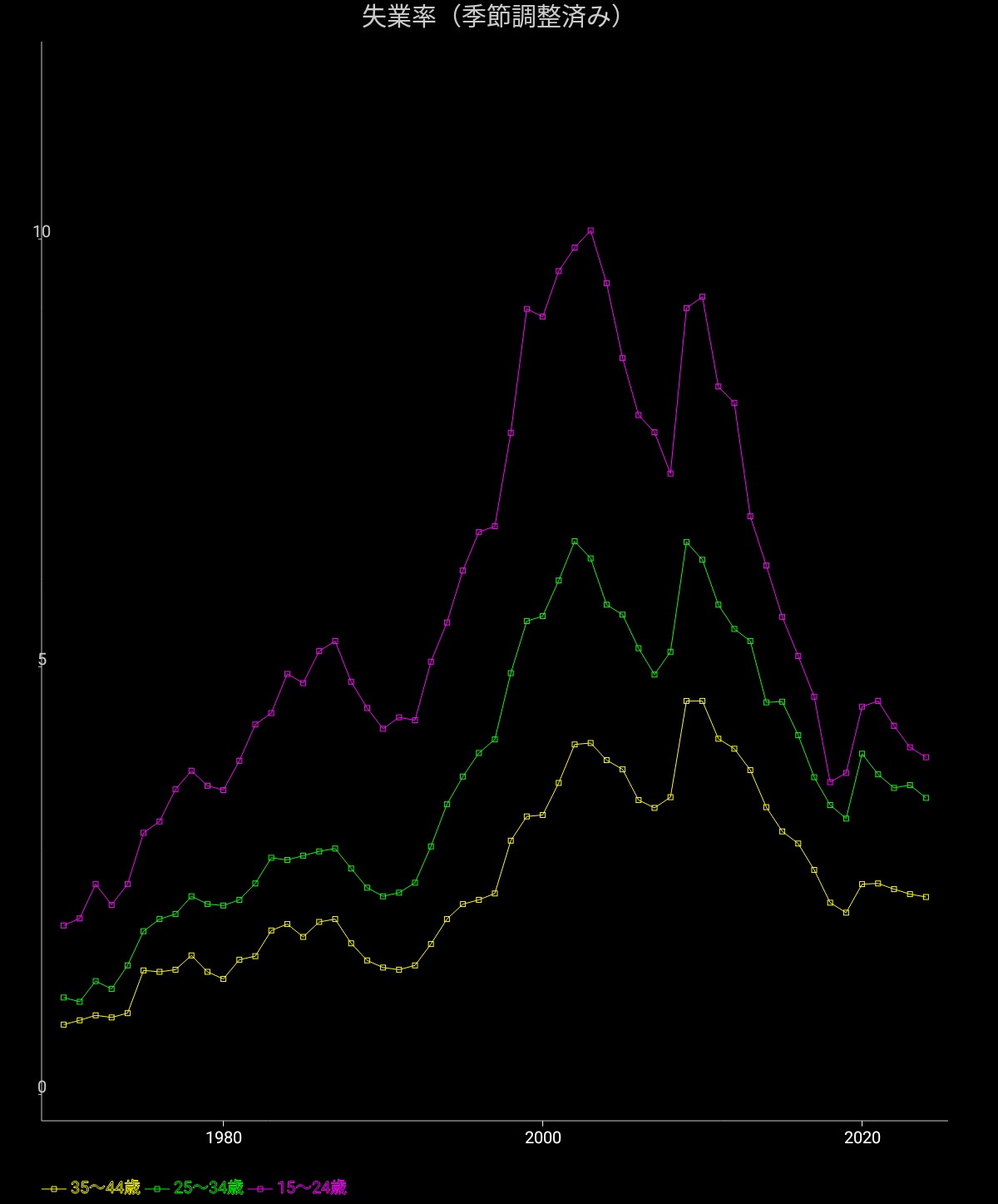 近年、若年層の失業率が高くなりながら中高年の失業率が高くならない、という現象が世界各国で見られます。